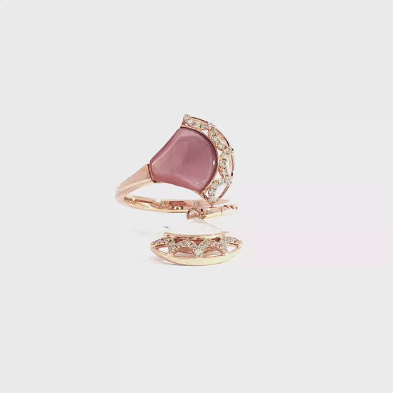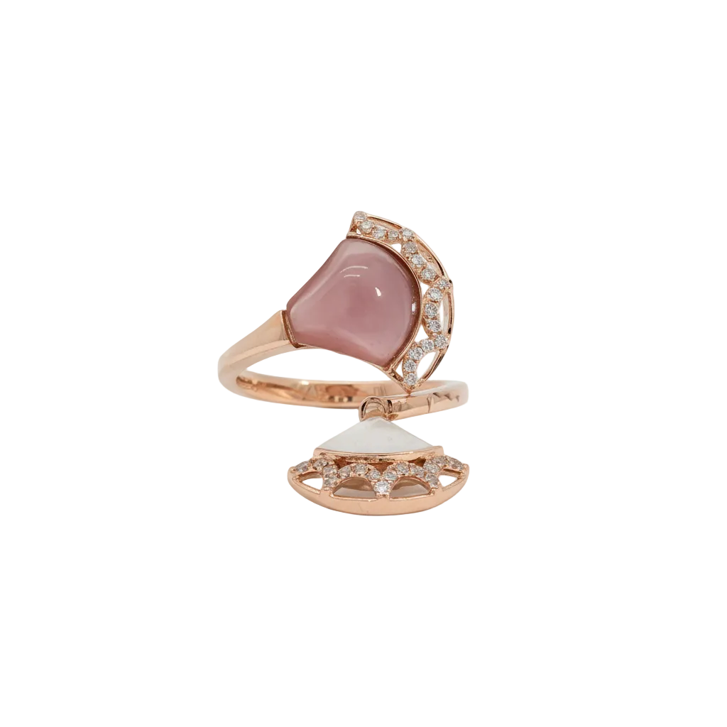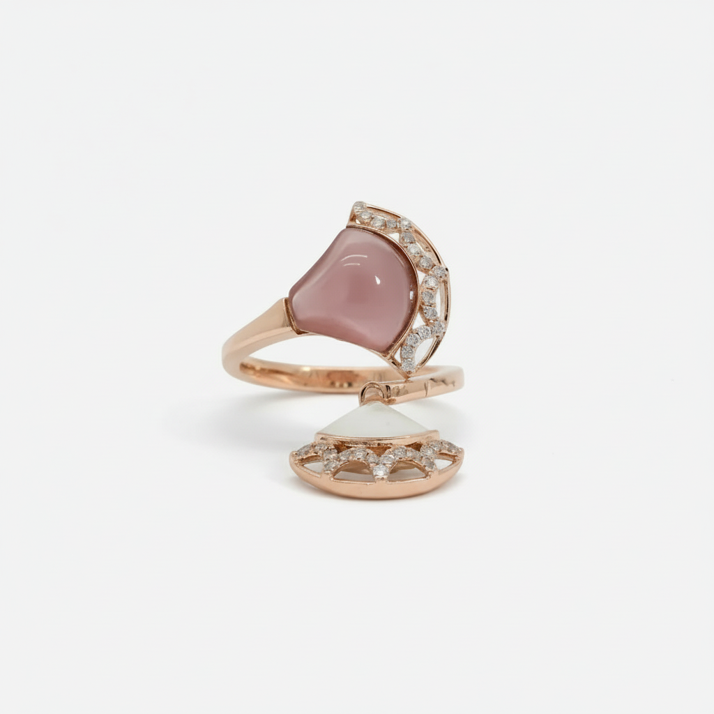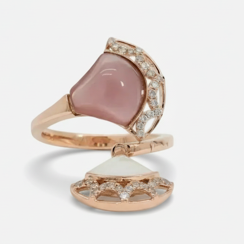 Indulge in the captivating charm of this rose gold multistone ring, featuring a mesmerizing reddish purple rose quartz cabochon. The cabochon cut enhances the gemstone's natural beauty, while the rose gold setting exudes warmth and elegance. This ring is a testament to refined taste and timeless design.