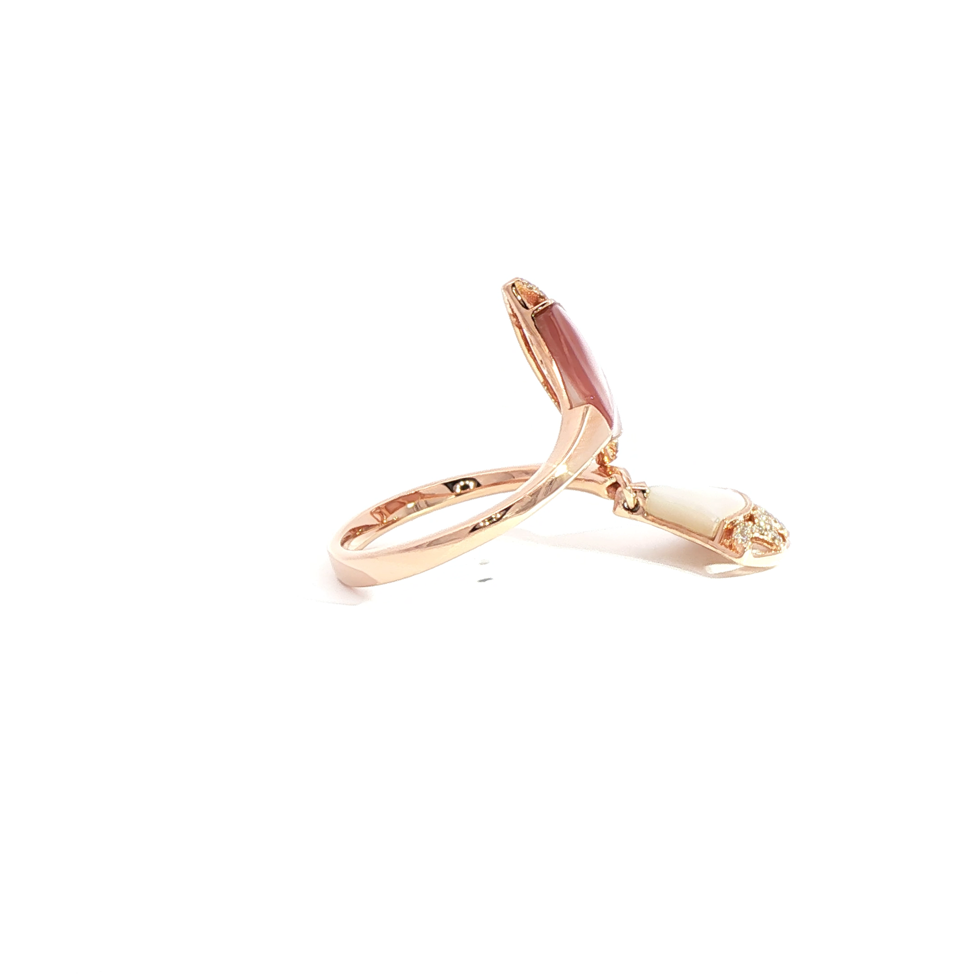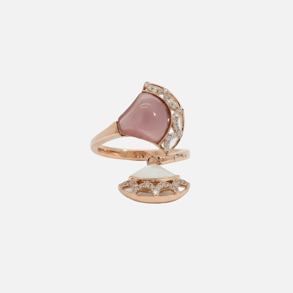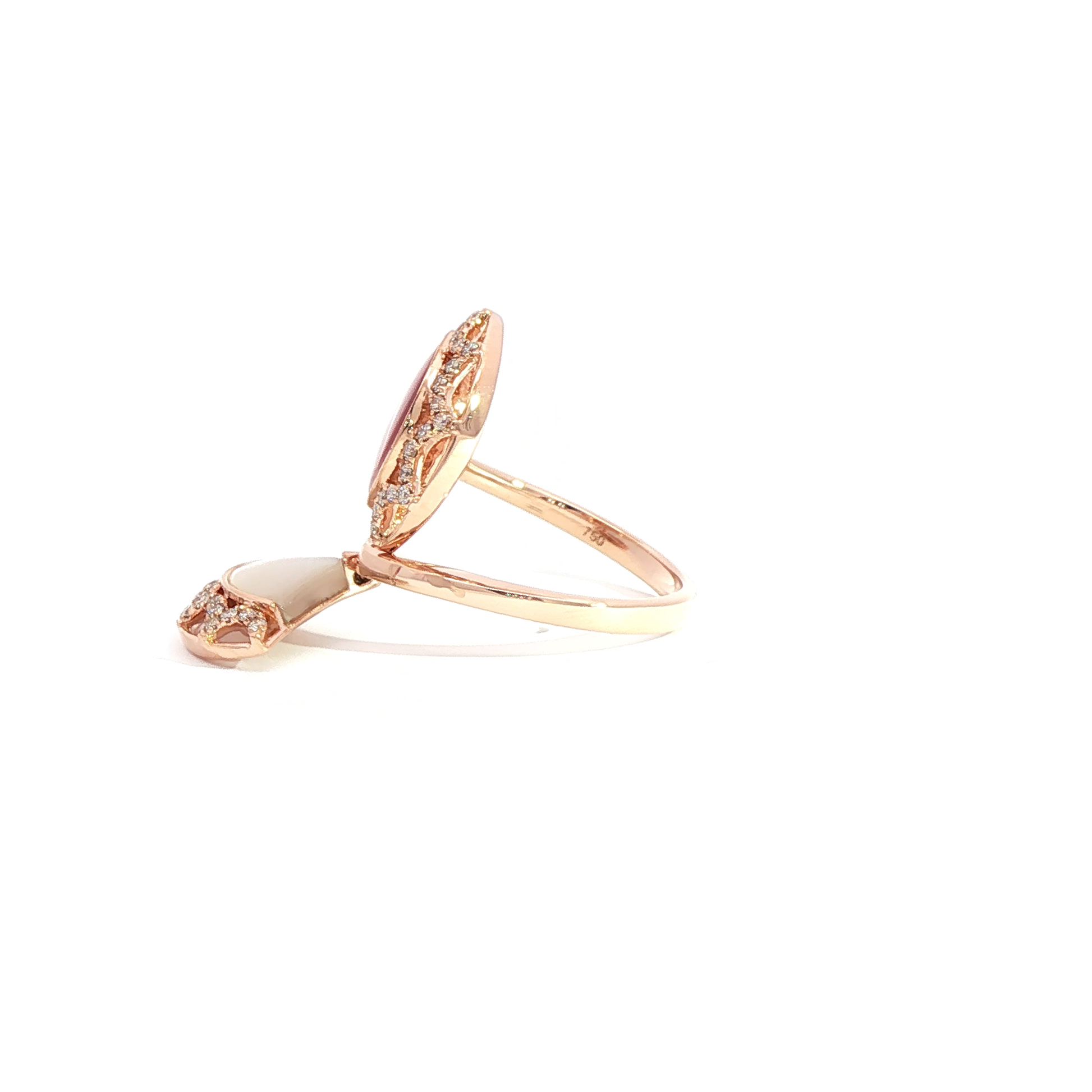 Indulge in the captivating charm of this rose gold multistone ring, featuring a mesmerizing reddish purple rose quartz cabochon. The cabochon cut enhances the gemstone's natural beauty, while the rose gold setting exudes warmth and elegance. This ring is a testament to refined taste and timeless design.